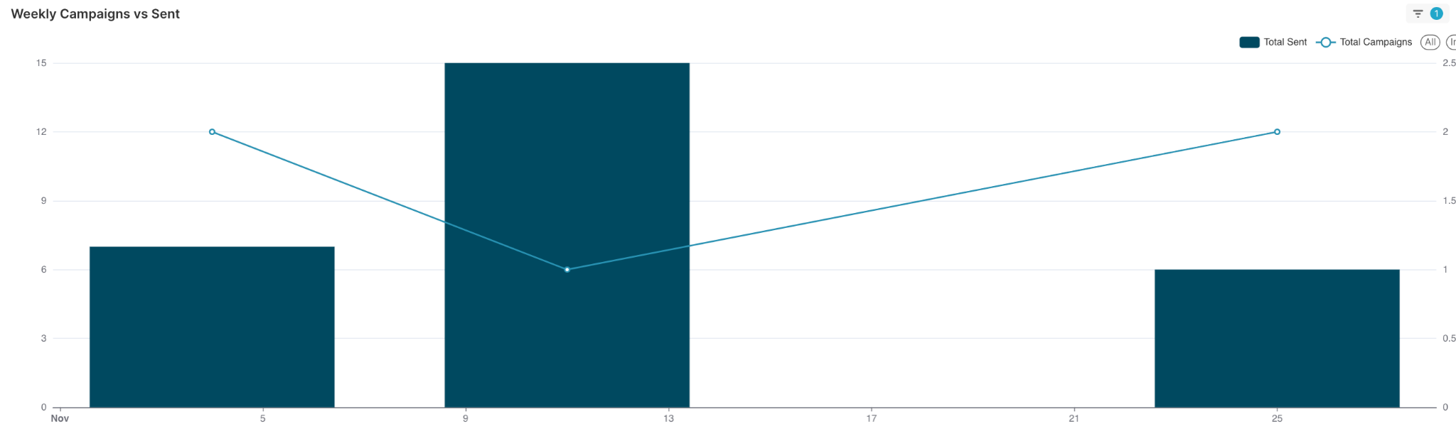This chart compares the number of campaigns executed each week against the total number of messages sent.Helps users track campaign volume and messaging frequency over time.