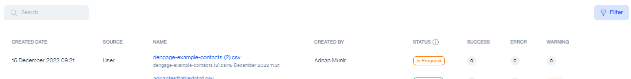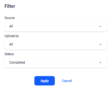 Filter Import: You can filter the import by choosing values from the “Source, Upload By, and status” drop-down.