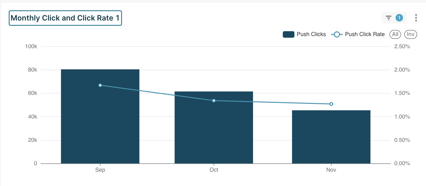 The Monthly In-App Clicks chart tracks the total number of clicks received on in-app messages each month.Helps users increase engagement levels and determine which messages drive the most interactions.