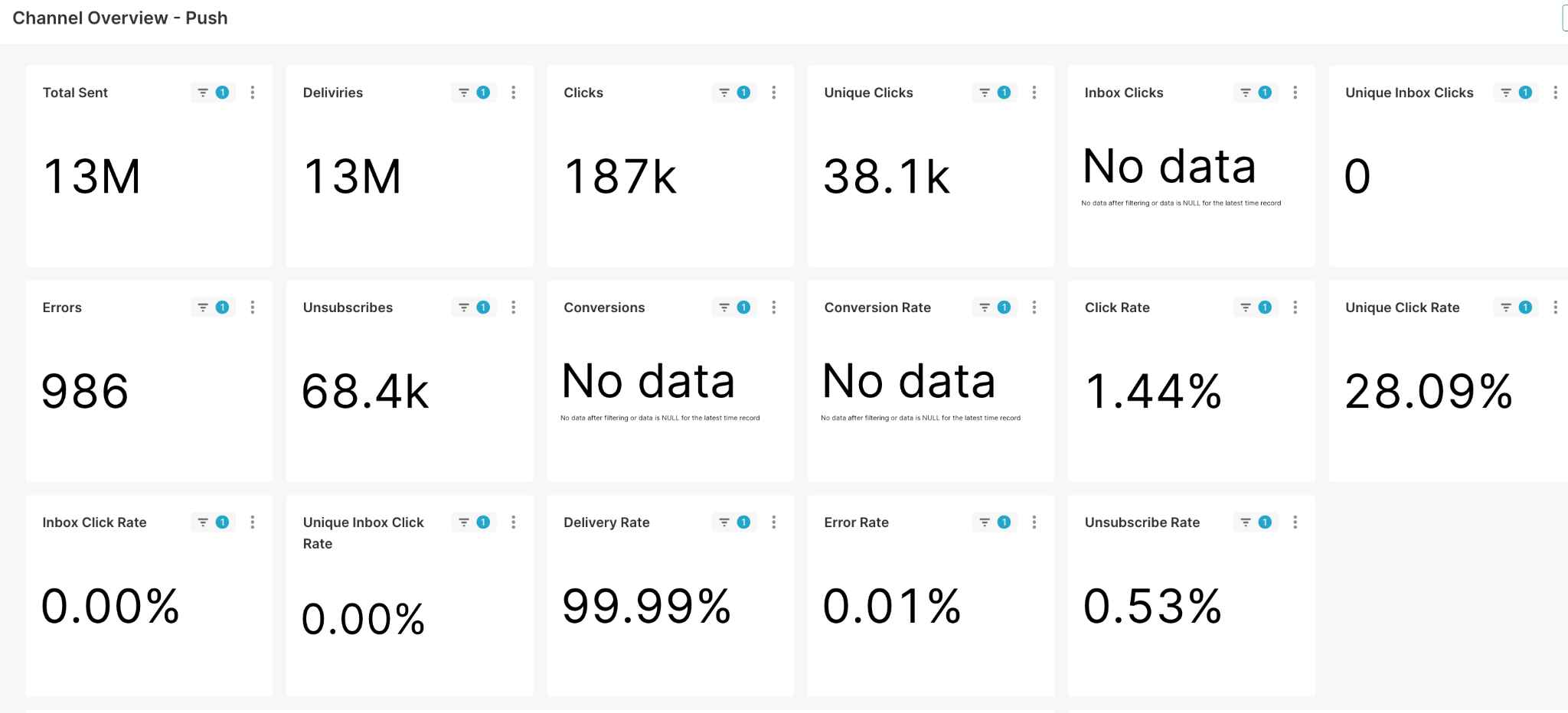 - Push: Provides insights into push notification performance, including delivery success and user interactions.