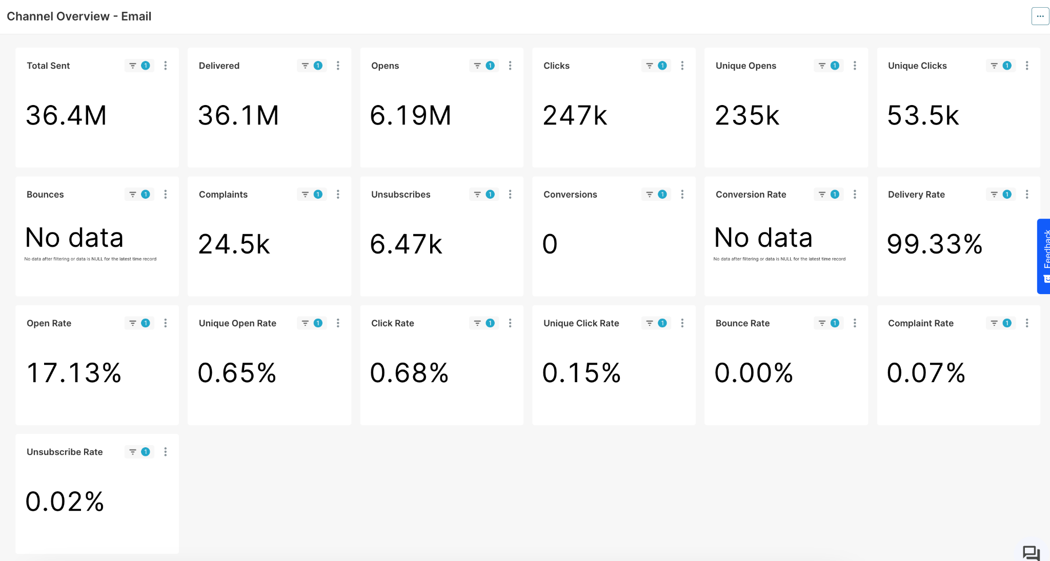 - Email: A high-level summary of all email campaigns, providing an overview of their overall performance.