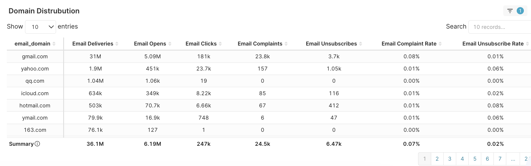 The table helps you track how your emails are performing for each domain. This allows you to spot trends, such as which domains are delivering better results or where issues (such as complaints or unsubscribes) are arising.