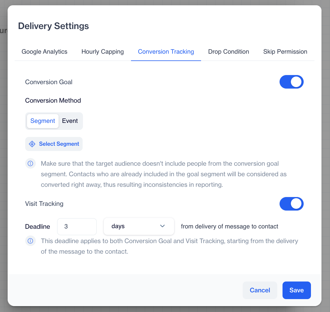 "This deadline applies to both Conversion Goal and Visit Tracking, starting from the delivery of the message to the contact."