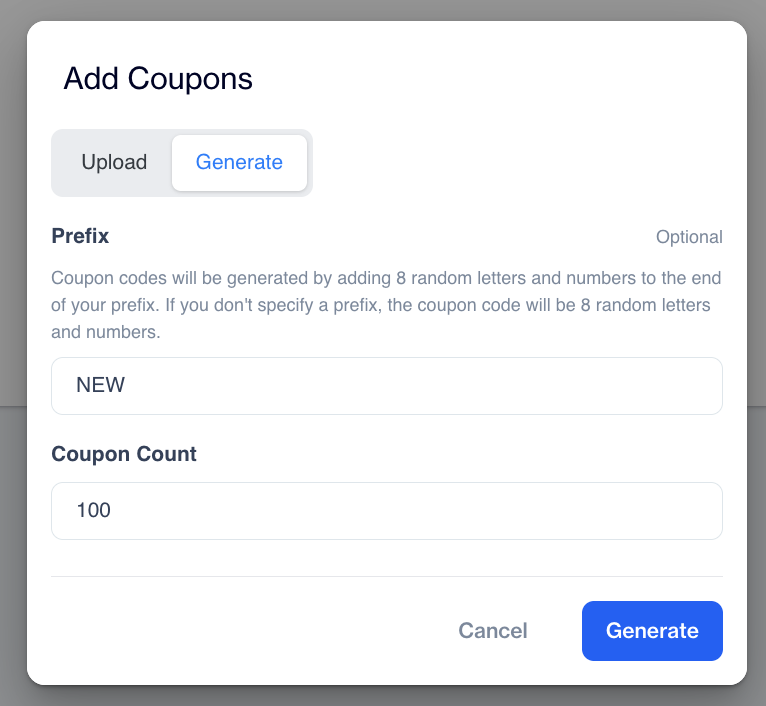 Coupon Code Generation allows you to create coupon codes directly inside a coupon list without uploading a file. Instead of preparing CSV or ZIP files, you can instantly generate unique coupon codes within the platform.