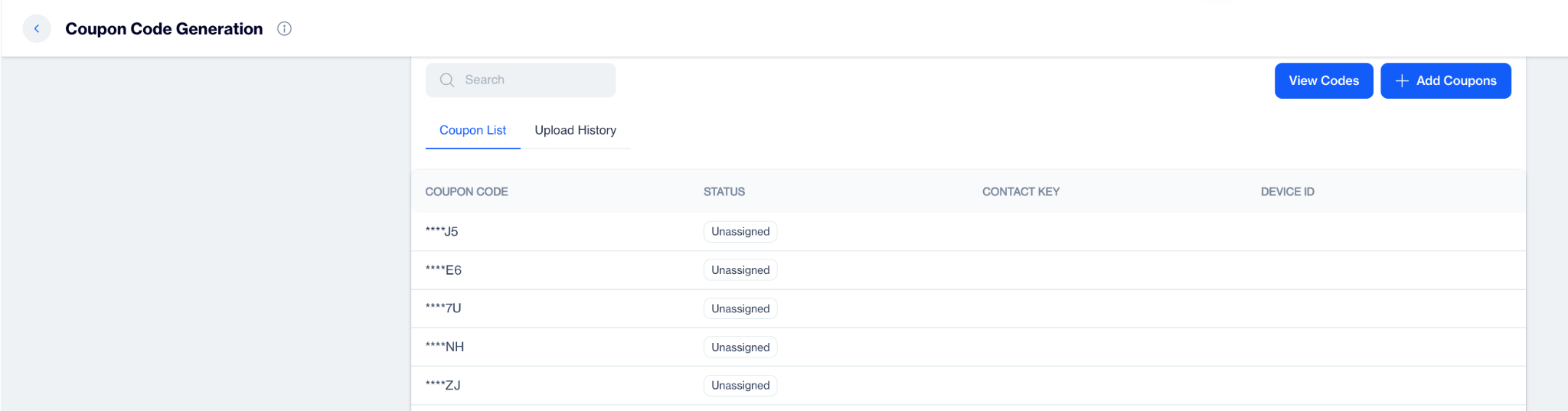 After generation, you are redirected to the coupon list screen, where all newly created coupon codes are displayed and ready for use.