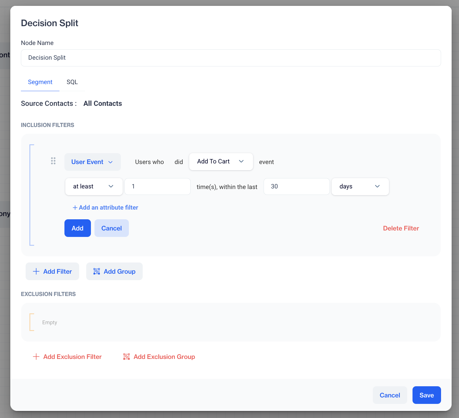 Set up your decision logic by adding filters to define which contacts should continue through this path. Once your conditions are in place, click OK to save. For example, you can create a segment that includes users who have made a purchase within the last thirty days.