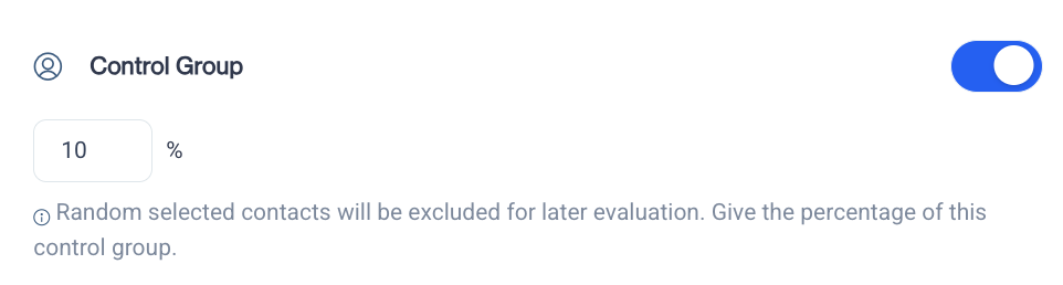 Control Group When the Control Group toggle is turned on, you can define the percentage of your audience that will be randomly excluded from receiving the campaign. These contacts form the control group and will be used for later evaluation of your campaign’s effectiveness. By default, the control group size is set to 10%, but you can adjust this percentage as needed.
