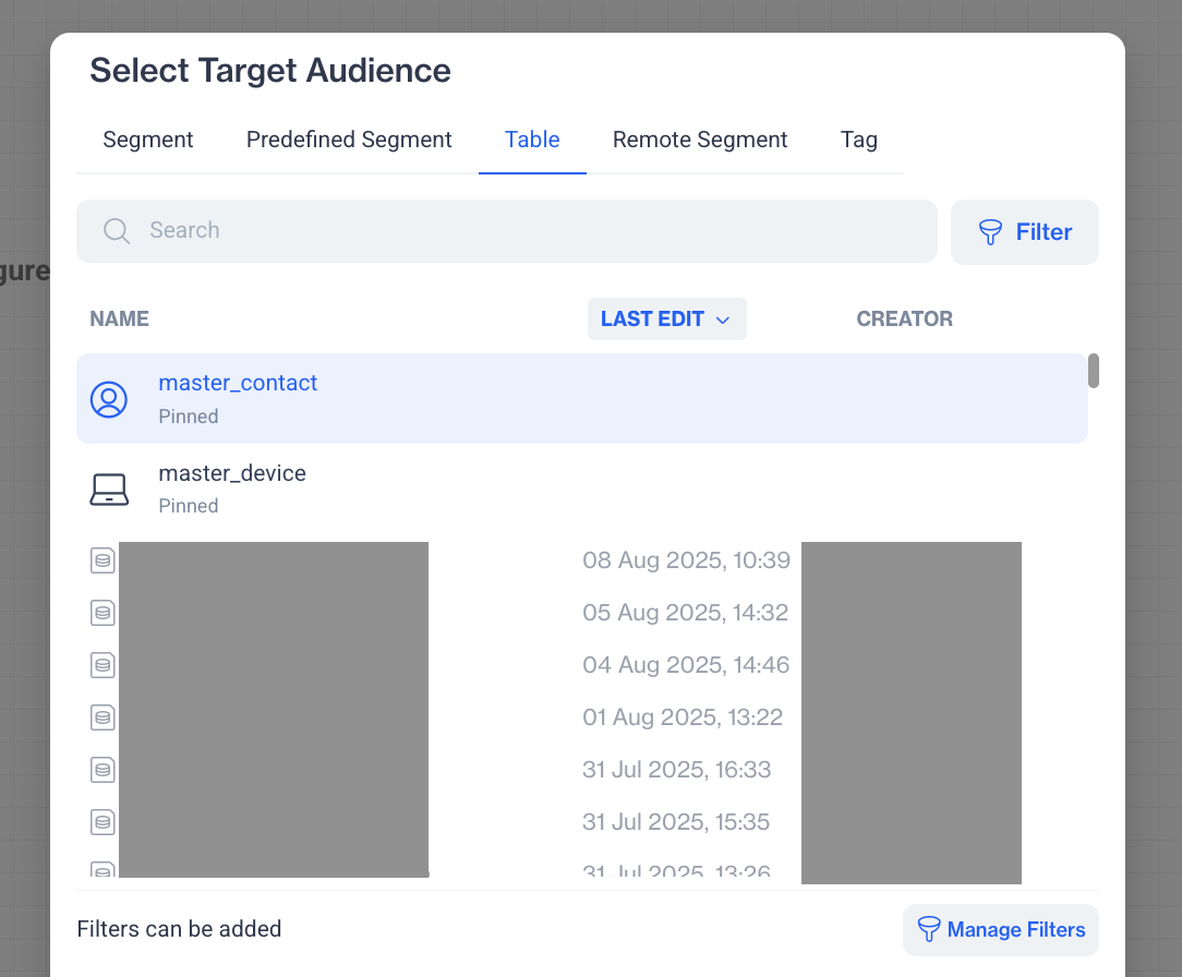 The Table tab allows you to choose from your existing data tables such as the Master Contact Table or Master Device Table to define who should receive your campaign. These tables hold the main contact or device information in your system. Once you select a table, you can apply additional filters to narrow your audience.This option is useful when your targeting criteria depend directly on detailed data fields in your contact or device structure.
