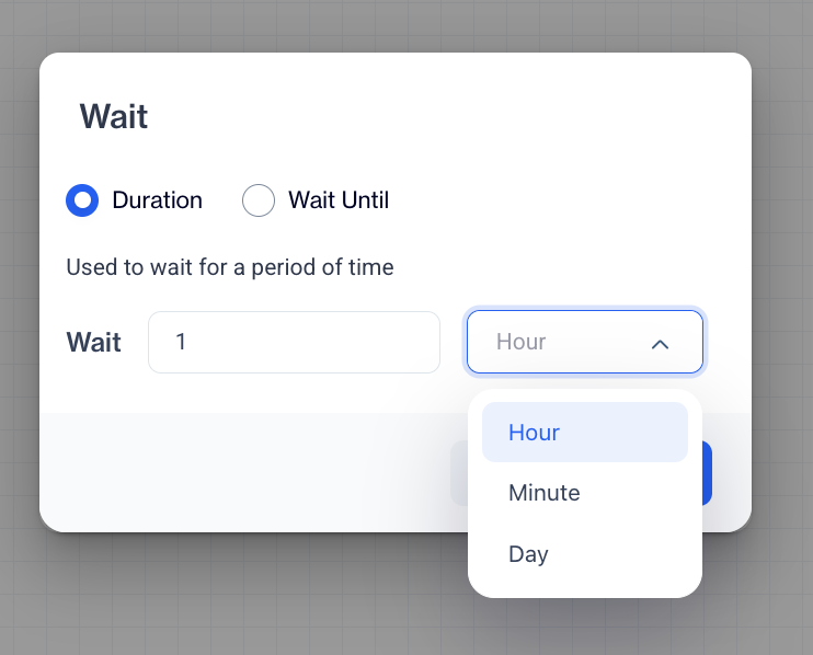 When you click on the Wait node, a configuration window will appear with two options: Duration and Wait Until.