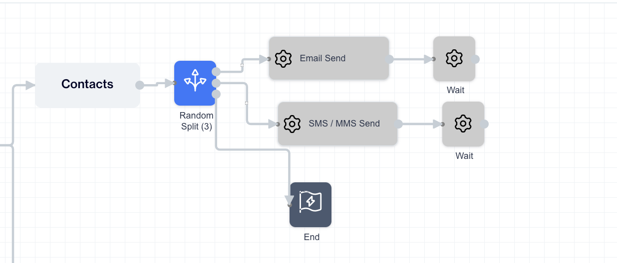 After setting your random split paths, connect each path to the next step in the journey. This could be an Action node (like Email or SMS) or a decision node (like a wait, or end).