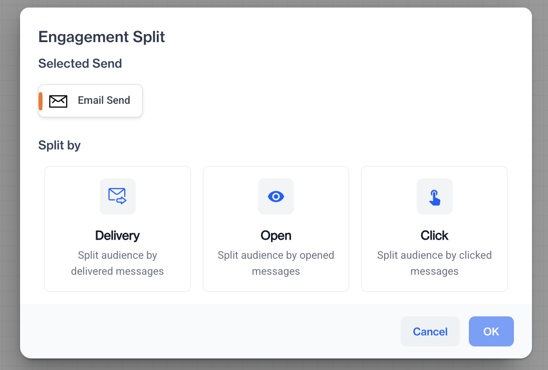 When you click on the Engagement Split node, you’ll see options to choose how to split the audience. These options depend on the type of send connected before it. For example:
