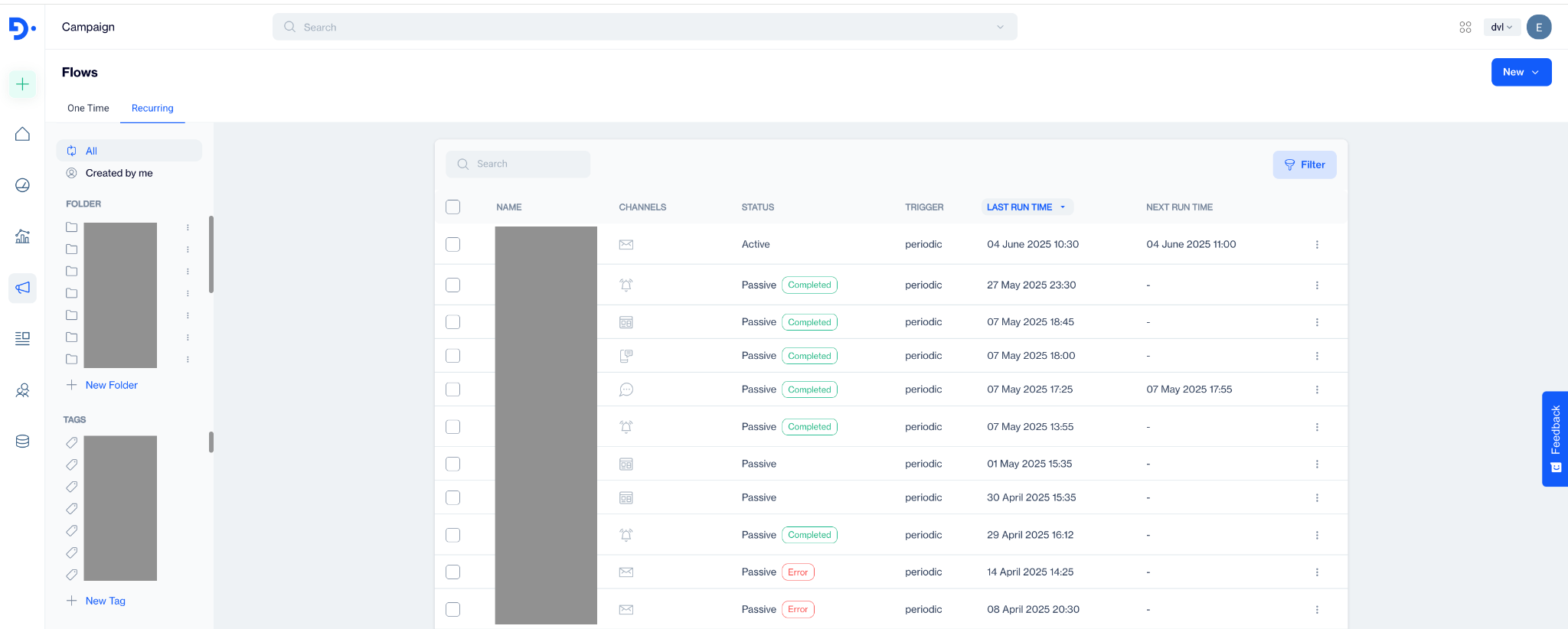 Use these filters to quickly locate and manage your recurring flows based on channel type, AI usage, status, schedule, and more.