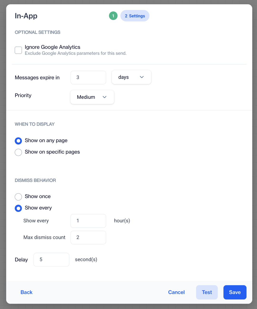 The Settings tab provides additional configuration options for fine-tuning message delivery.