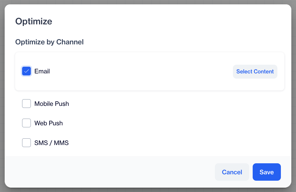 To set up Optimize Channel, start by selecting the channels you want the system to optimize for. You can choose one or more from the available options—Email, SMS/MMS, Mobile Push, and Web Push. These are the channels through which your campaign message may be sent, depending on each user's engagement history.