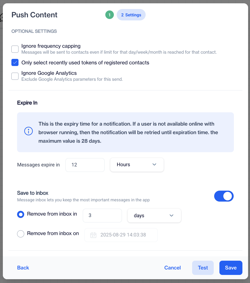 Further settings let you control how long the message remains valid and whether it is stored in the push inbox.