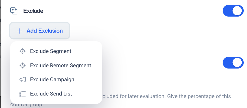 Exclusions When the Exclusions toggle is turned on, the Add Exclusion button becomes available. Clicking this button opens a dropdown menu where you can choose from the following options: Exclude Segment, Exclude Remote Segment, Exclude Campaign, or Exclude Send List. This allows you to remove specific groups from your target audience. You can add multiple exclusions to refine your audience more precisely.