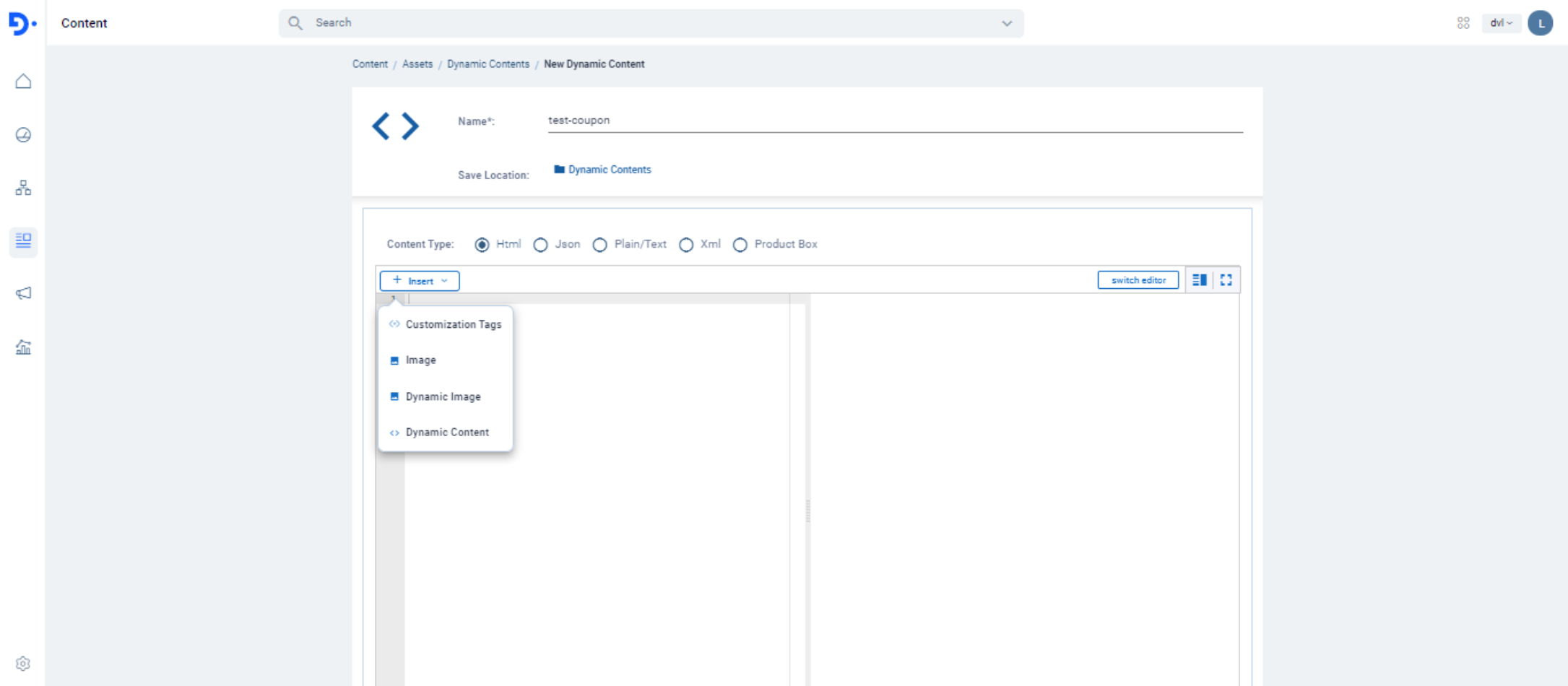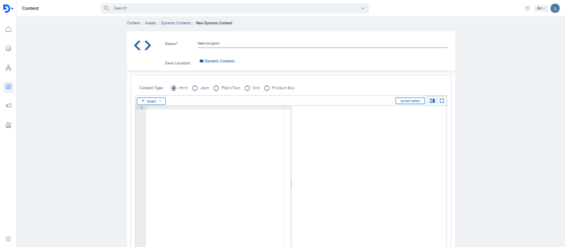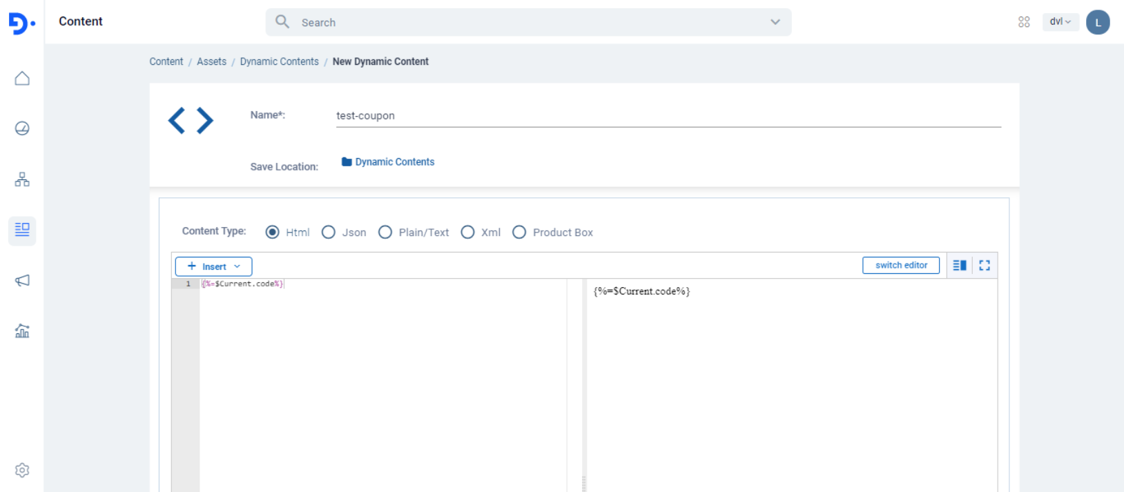 - Create a code snippet you need to go to the Dynamic Contents section under the Content tab from the left menu bar in the CDMP.