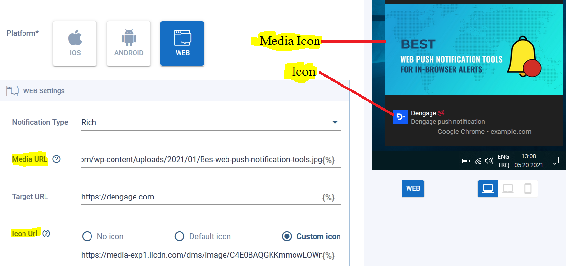 2) Media Icon (notification image) size should be no more than 364X180px with an aspect ratio of 2:1.