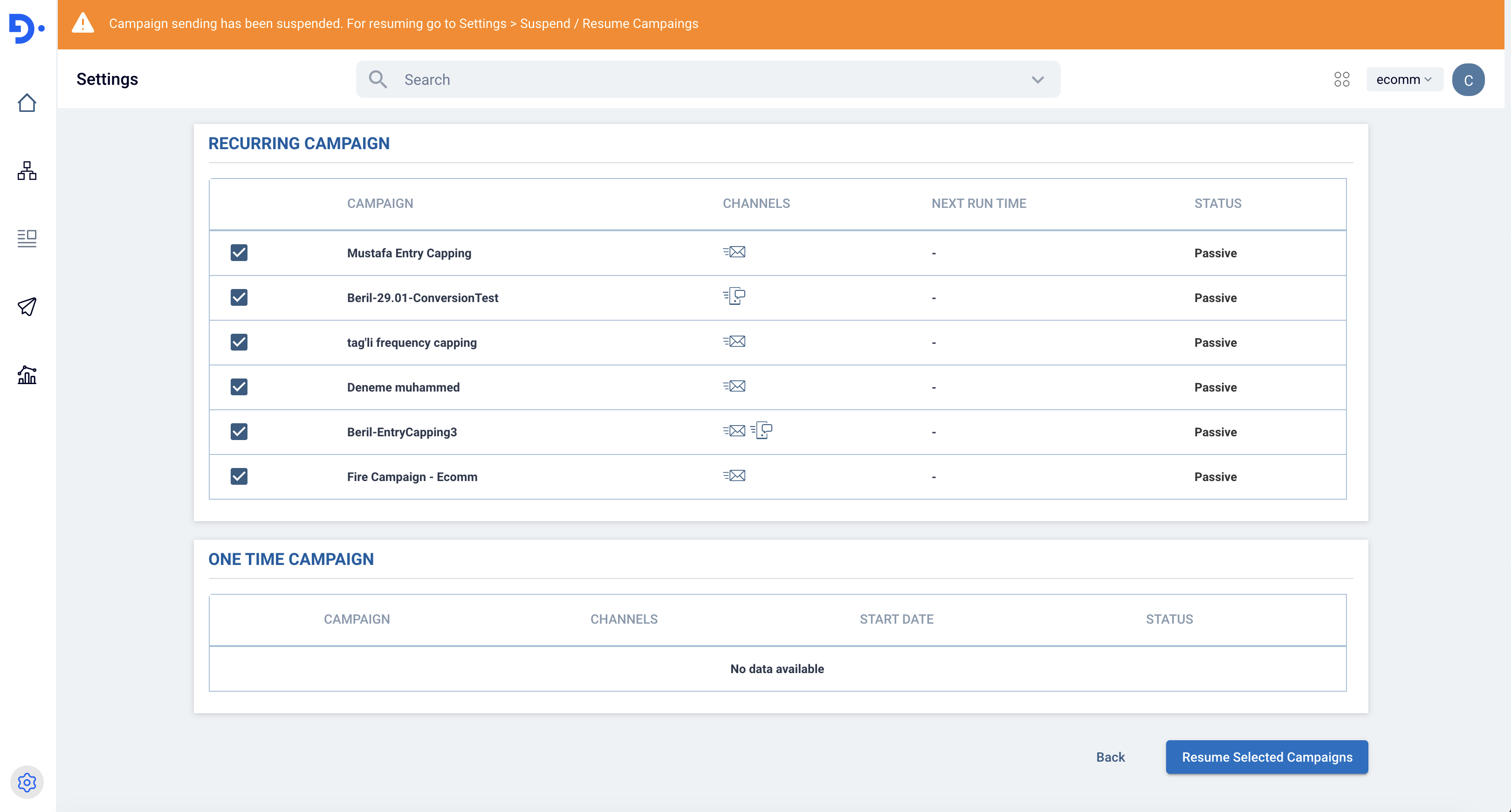 Navigate to D·engage platform select Settings > Resume / Suspend Campaign. You will see a list of all the running and scheduled Recurring and One-Time Campaigns.