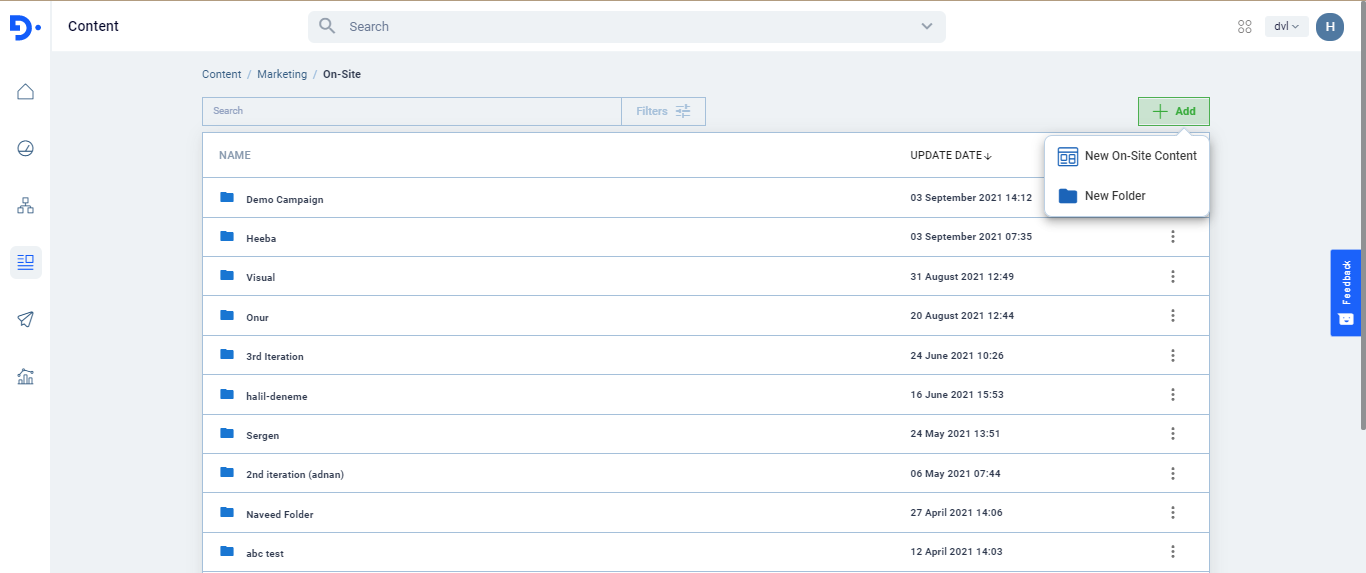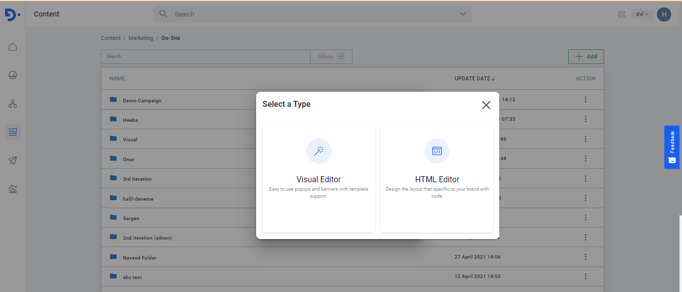 - Send on site message: By clicking the “Send Onsite Message” option, a new popup window is shown for sending options. User can choose any option for sending either chosen "Predefined audience” or choose “Type-in Contact Key” for sending content to the relevant address by clicking the “send test on-site” button option.
