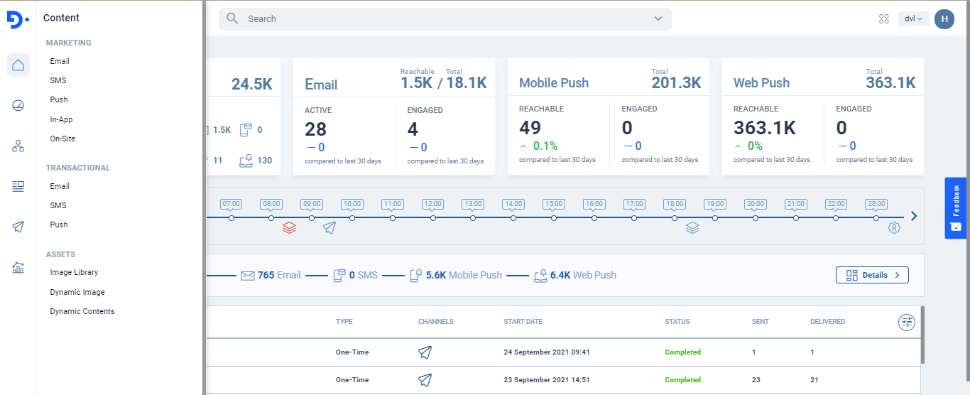 - View report: By clicking the “View Report” option, a new details page opens. That statistics shows all details about sent, dismiss, displayed and more details in pictorial format also. By clicking on any number from “Total Message”, “Displayed”, “Click”, and “Dismissed” details, new page is shown having relevant information.