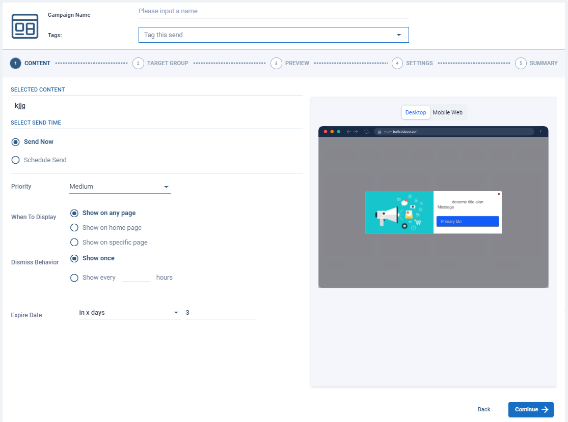 ● Name and Tags: User can enter the name in “Campaign Name” and choose the “Tags” option also from selection area.