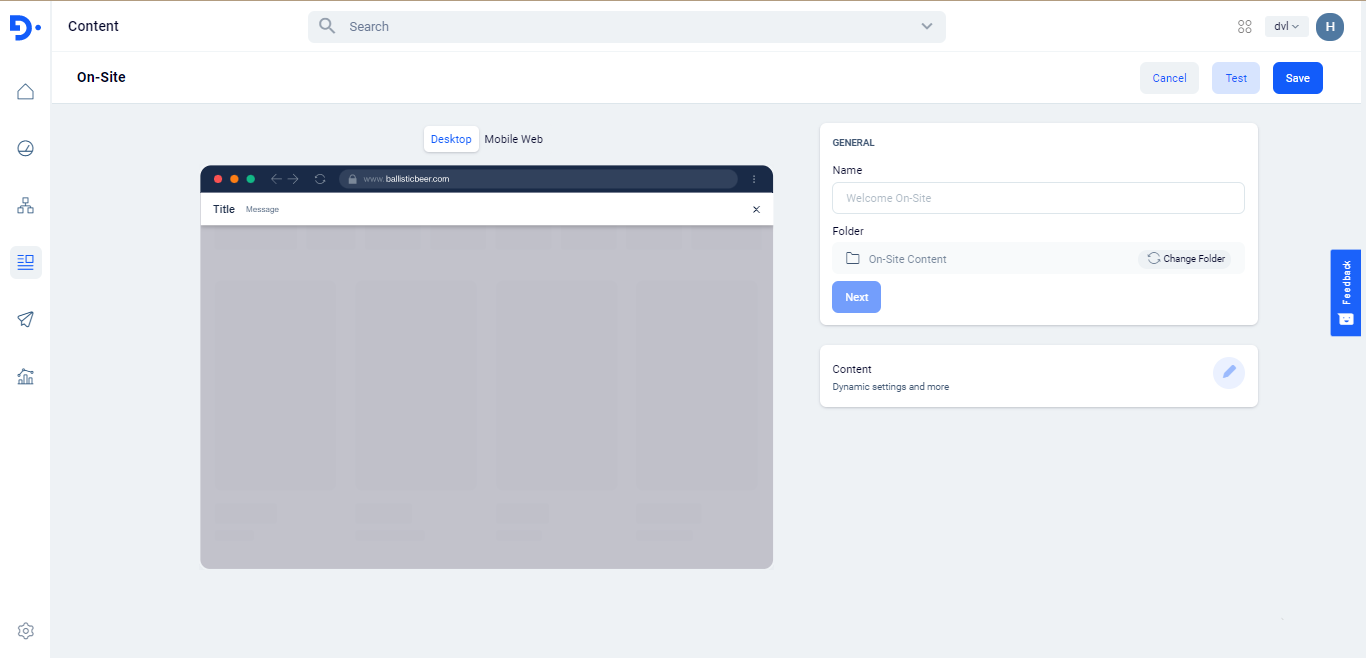 Test and Preview: Test, save and cancel options also shown on top right bar of page. By clicking “Cancel” option user will redirected to main page of “On-site”.