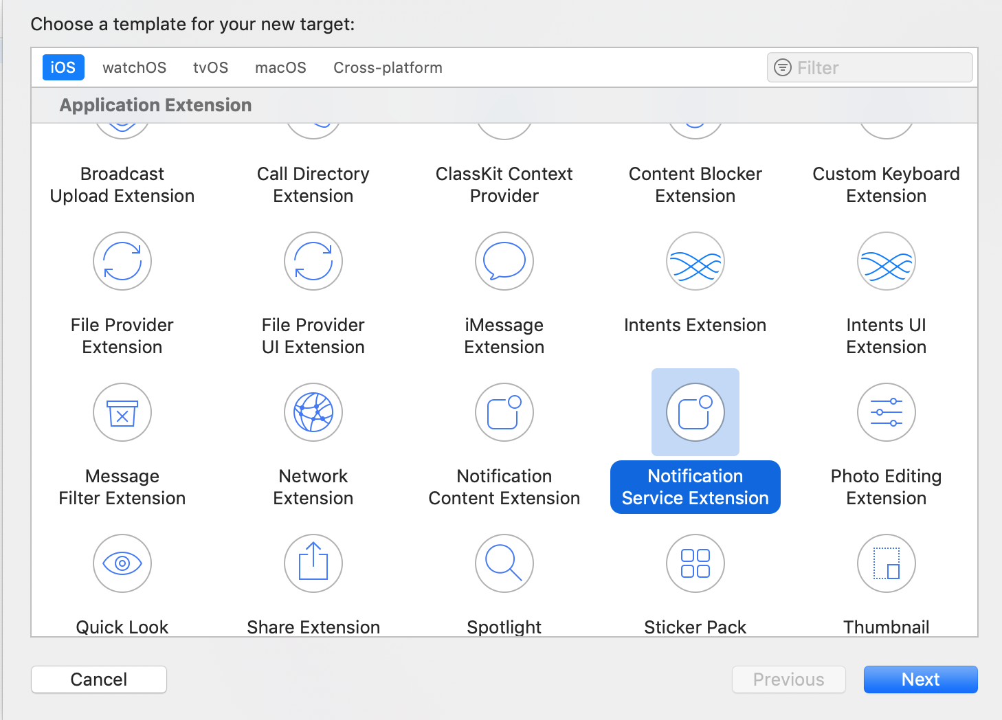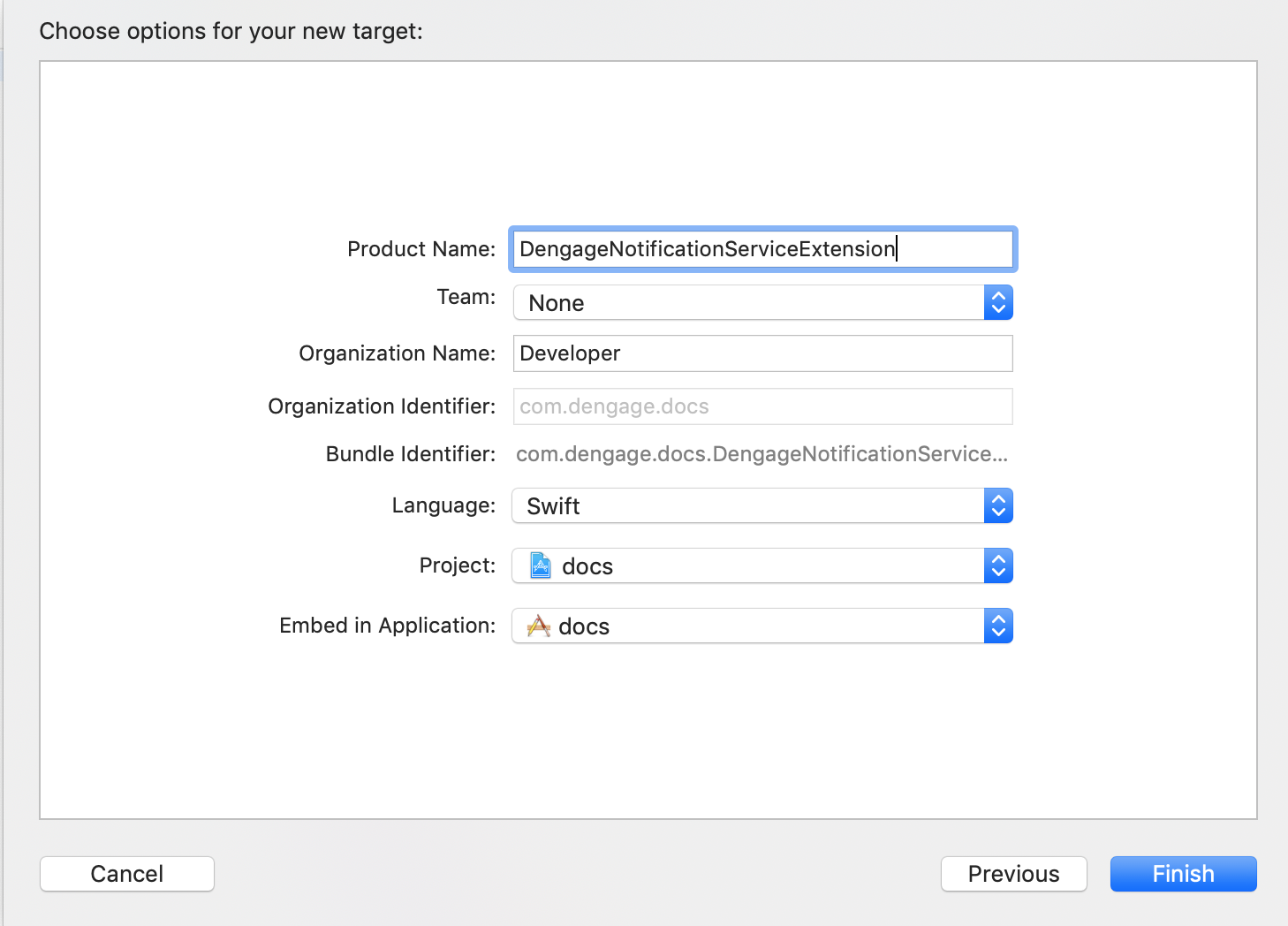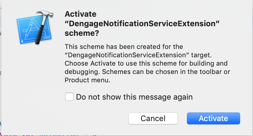 File > New > TargetNotification Service Extension then press Next.DengageNotificationServiceExtension and press Finish.Cancel on the Activate scheme prompt.NotificationService.swift and replace the whole file contents with the below code. override func didReceive(_ request: UNNotificationRequest, withContentHandler contentHandler: @escaping (UNNotificationContent) -> Void) {