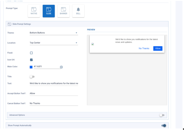 1.3 Select the appearance of the Web Push permission message from the “Prompt Type” options