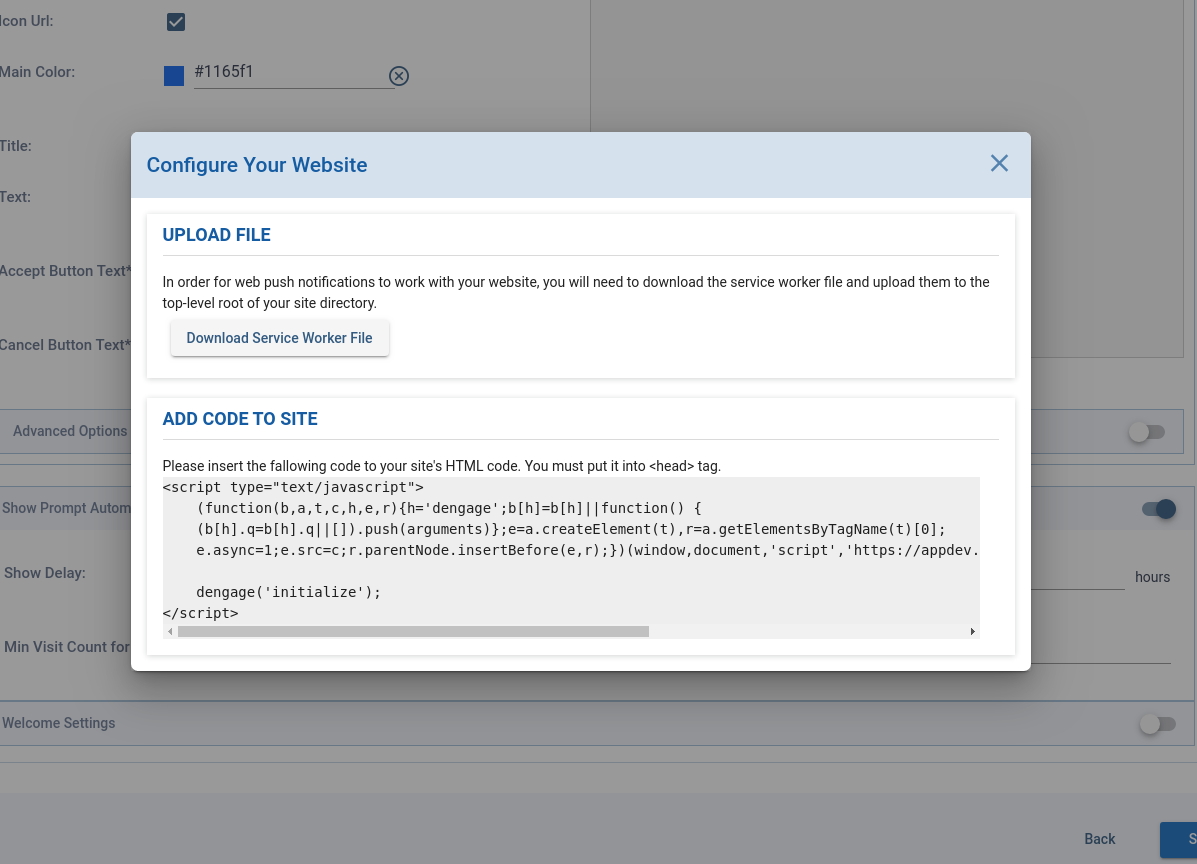 Once you have created the Push Application from the D·engage web UI, your website integration information will appear as shown below.