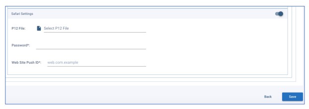 3.14 You should now be able to take this .p12 file and upload to your dEngage Account. From Settings > Application, click the web application you want to add the certificate to. Next, open Push Notifications, then at the bottom, open the Safari Settings. Once you upload .p12 file, insert password and type your web site push ID, then click on Save.