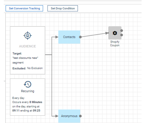 Add the Shopify coupon node to the campaign canvas and specify the coupon code as shown in the figure below.