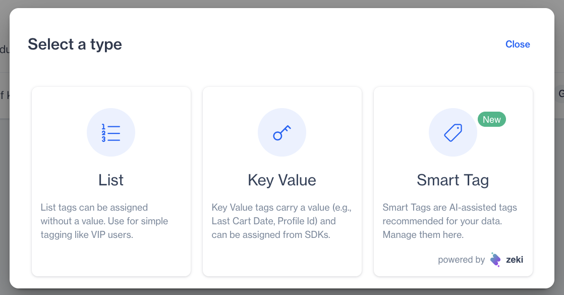 Smart Tags is an AI-powered feature that helps you create meaningful tags automatically by using your existing business and product data. Instead of defining all tags manually, the system analyzes your data and suggests ready-to-use tags that can later be assigned to users based on their behaviors.