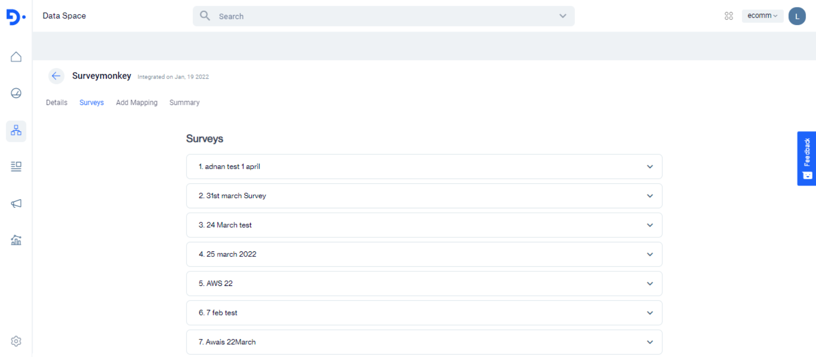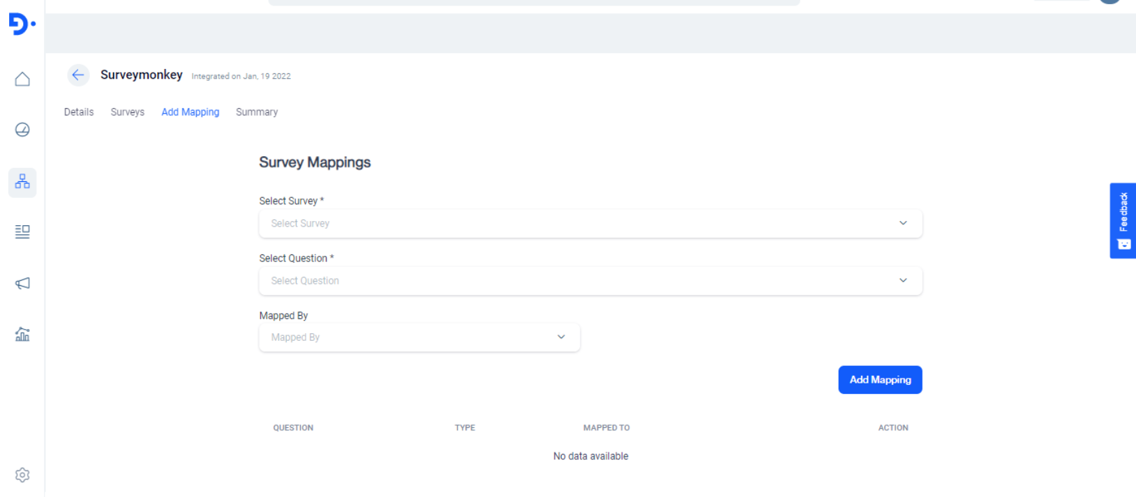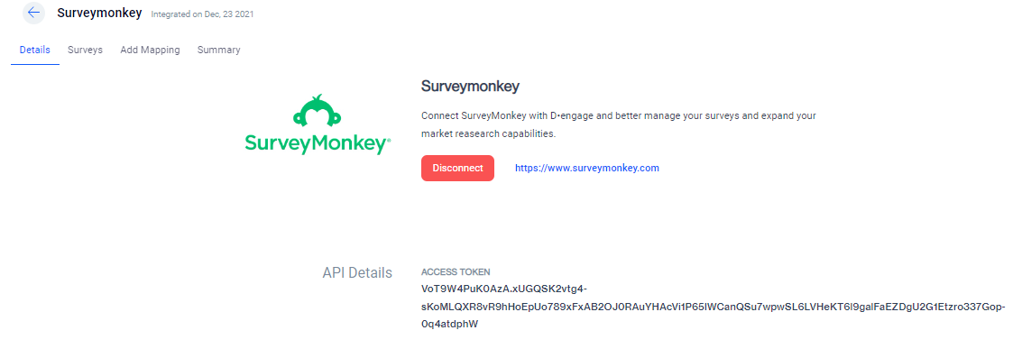 After successful integration, you’ll be able to see three tabs “Details”, “Surveys” and “Add Mapping”. The details page will display Survey Monkey Details and API details.
