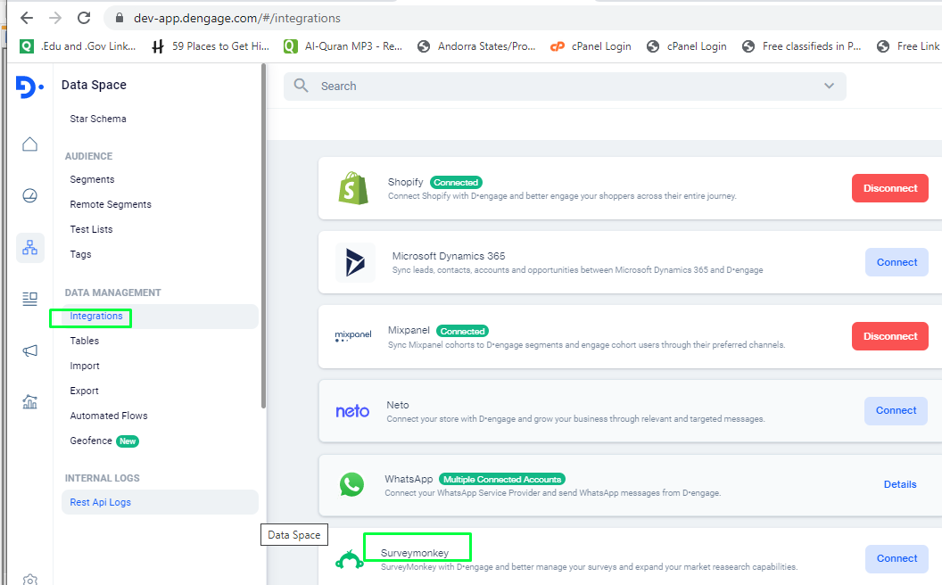 Navigate to Dataspace - Integrations from the left menu bar.