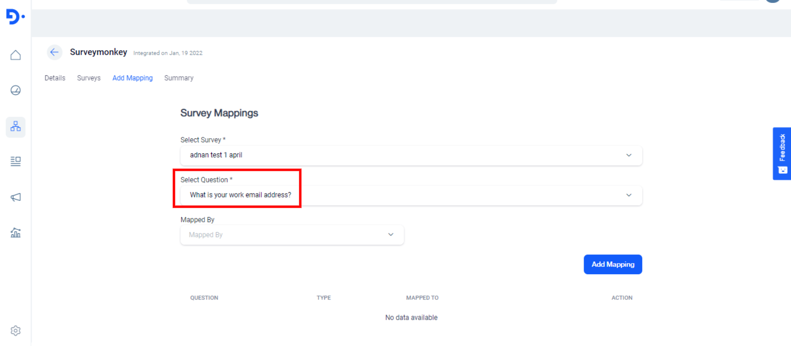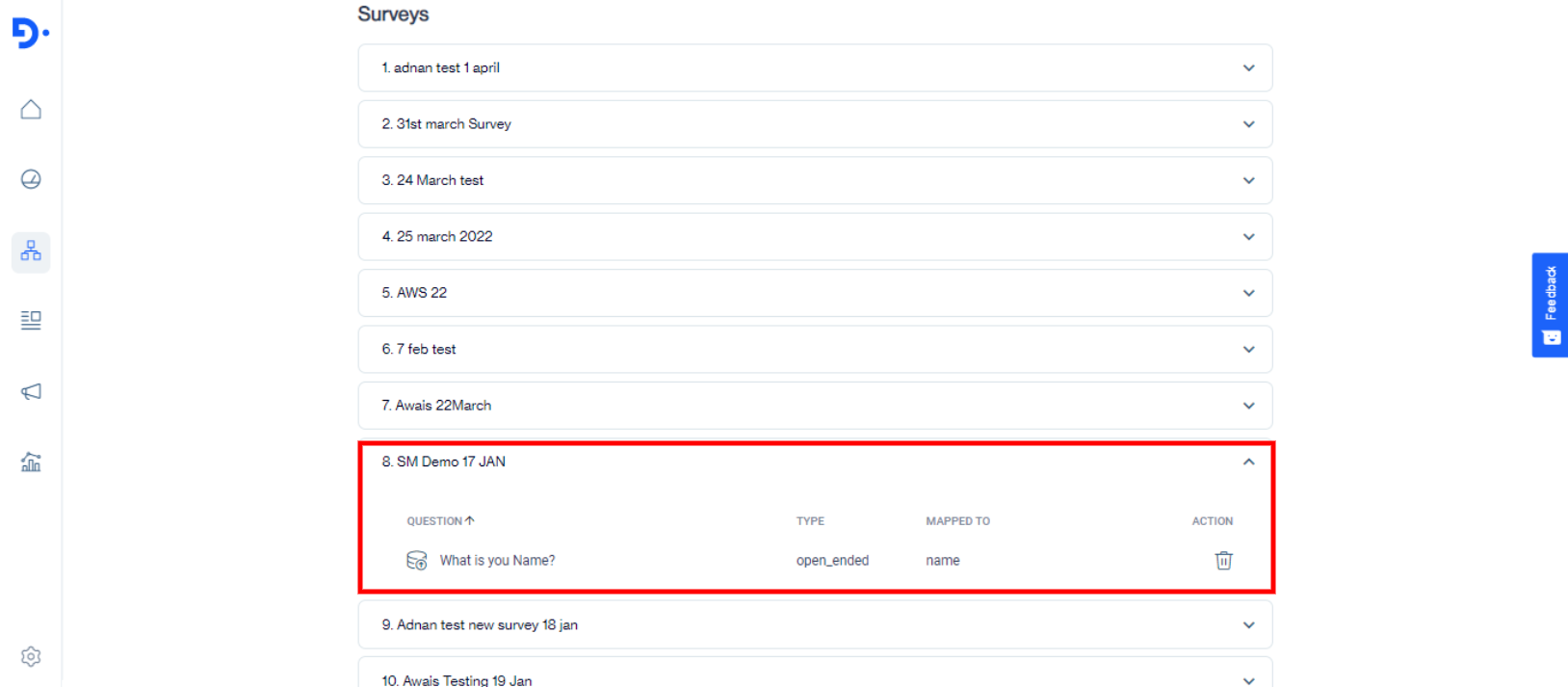 The system displays all the information of that survey Like “Questions”, “Type”, “Mapped To”, “Action”.