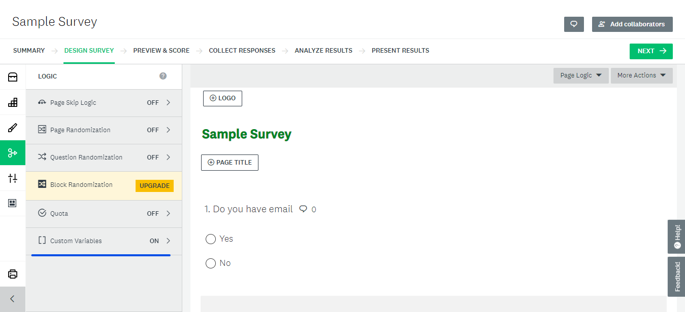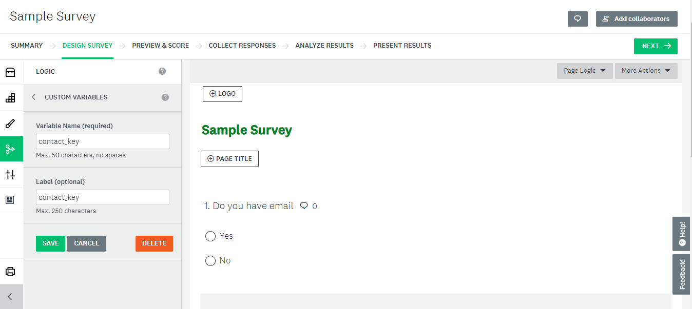 On the "Design Survey" tab of Survey wizard, select CUSTOM VARIABLES from the Logic section of left Navigation.