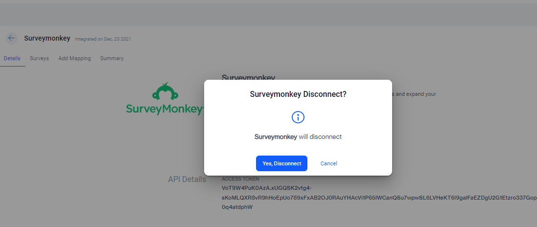 Note: These details are updated every six hours. At any stage, you can disconnect your Surveymonkey account by clicking on the “Disconnect” button. On disconnecting an account, there will be a confirmation pop-up.