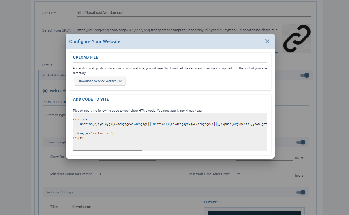 2. Create a new web application and fill in the necessary details. Once done with that it will provide you the setup guide like below. Copy the code and download the service worker file.
