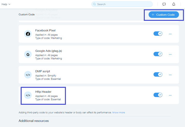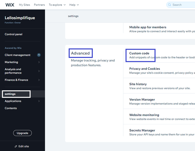 5. Click Settings, scroll down to Advanced section and select Custom Code.