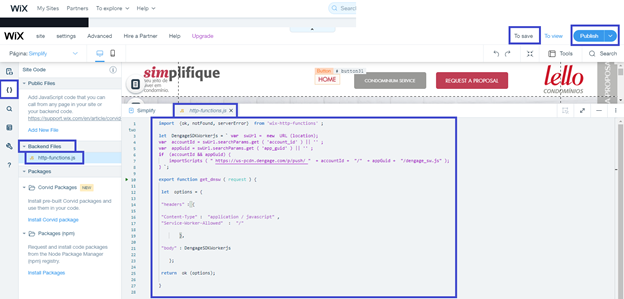 7. Paste the script you copied in the step 2 here and replace the dengage('initialize'); in line 2 with dengage('initialize', {swUrl: '/_functions/dnsw'});