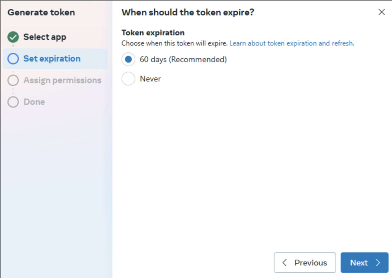 Next, you’ll be prompted to choose the token expiration period. You can select either 60 days or Never.